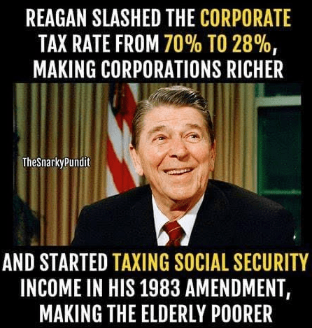 Cutting the corporate tax rate from 70% to 28% sounds great: if you’re in industry, or on the receiving end of corporate largess from lobbyists. To say that Social Security is insolvent doesn’t begin to address the real problem: a theft in plain sight occurred, and reparations – not just slavery in the 1860s, but 1980s reparations – have yet to be paid.