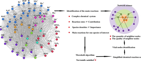 Cold atmospheric plasmas have great application potential due to their production of diverse types of reactive species, so understanding the production mechanism and then improving the production efficiency of the key reactive species are very important. However, plasma chemistry typically comprises a complex network of chemical species and reactions, which greatly hinders the identification of the main production/reduction reactions of the reactive species. Previous studies have identified the main reactions of some plasmas via human experience, but since plasma chemistry is sensitive to discharge conditions, which are much different for different plasmas, widespread application of the experience-dependent method is difficult. In this paper, a method based on graph theory, namely, vital nodes identification, is used for the simplification of plasma chemistry in two ways: (1) holistically identifying the main reactions for all the key reactive species and (2) extracting the main reactions relevant to one key reactive species of interest. This simplification is applied to He + air plasma as a representative, chemically complex plasma, which contains 59 species and 866 chemical reactions, as reported previously. Simplified global models are then developed with the key reactive species and main reactions, and the simulation results are compared with those of the full global model, in which all species and reactions are incorporated. It was found that this simplification reduces the number of reactions by a factor of 8–20 while providing simulation results of the simplified global models, i.e., densities of the key reactive species, which are within a factor of two of the full global model. This finding suggests that the vital nodes identification method can capture the main chemical profile from a chemically complex plasma while greatly reducing the computational load for simulation.