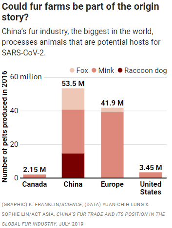 Live animals can more easily transmit a respiratory virus than meat from a butchered one, and the animals included masked palm civets, the main species that transmitted SARS-CoV to humans, and raccoon dogs, which also naturally harbored that virus and have been infected with SARS-CoV-2 in lab experiments. Minks—a species farmed for fur that has acquired SARS-CoV-2 infections from humans in many countries— were also abundant. “None of the 17 shops posted an origin certificate or quarantine certificate, so all wildlife trade was fundamentally illegal,” Zhou and his colleagues wrote in their paper. (Zhou did not respond to emails from Science.)