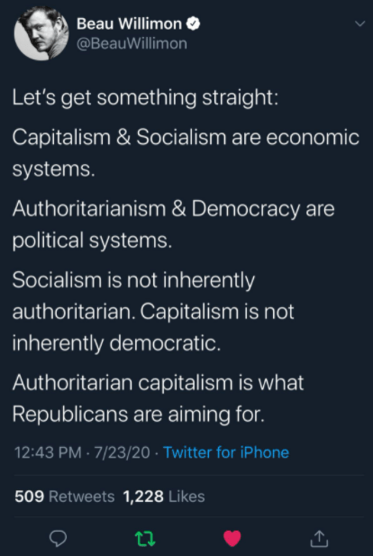 Scalise once described himself as “David Duke without the baggage.” David Duke was a grand dragon, and avowed white supremacist. Any kind of supremacy is anathema to democracy. To quote a 2020 tweet from someone named Beau Willimon, succinctly comparing Capitalism, Socialism, Authoritarianism, and Democracy: