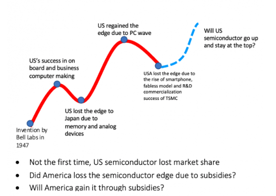 The US semiconductor industry started with the invention of Bell Labs. Subsequently, it attained supremacy in semiconductor production due to the success of making computers better and cheaper. Notably, the rise of the PC wave made Intel and Silicon Valley seemingly unsinkable technology superpowers. But during the first two decades of the 21st century, America has lost it. The USA now relies on Asia to import the most advanced chips. Its iconic Intel is now a couple of technology generation behind Asia’s TSMC and Samsung.