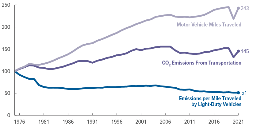 Emissions of Carbon Dioxide in the Transportation Sector, Motor Vehicle Miles Traveled, and Emissions per Mile Traveled by Light-Duty Vehicles Measured as a Percentage of Their Value in 1975 – Transportation sector emissions have not risen nearly as much as vehicle miles traveled because gains in fuel economy have reduced emissions per mile of travel.