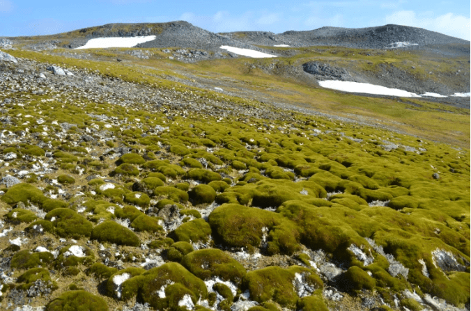 Hummocks of moss cover Ardley Island off the tip of the Antarctic Peninsula. Credit: Dan Charman